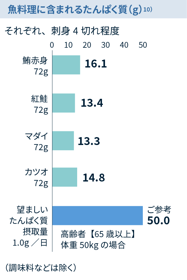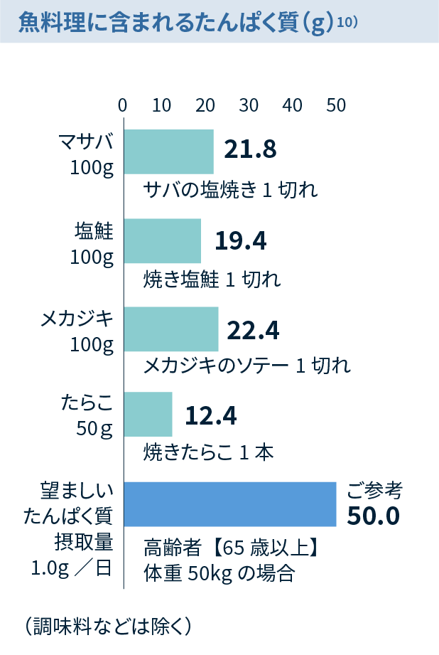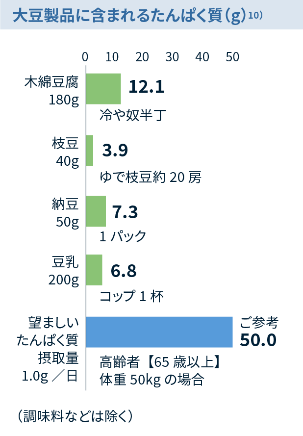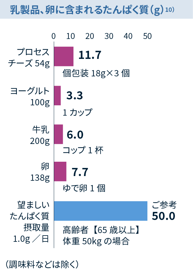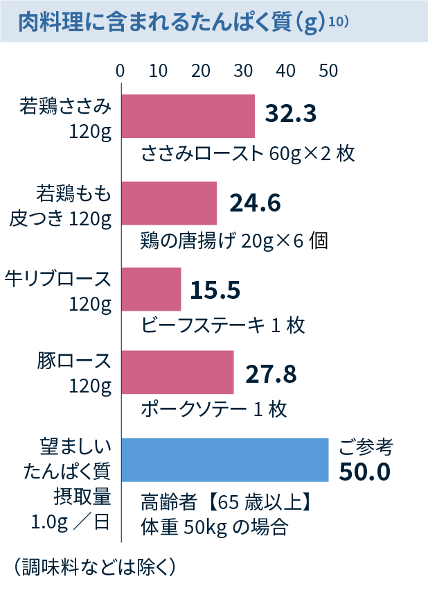 高齢者(65歳以上)では、少なくとも 1.0g/kg 体重/日以上のたんぱく質を摂取することが望ましいと考えられています。9)*慢性腎臓病などのたんぱく質制限を要する場合を除く